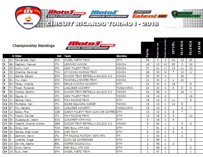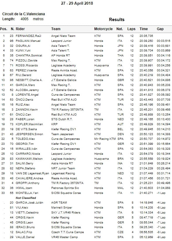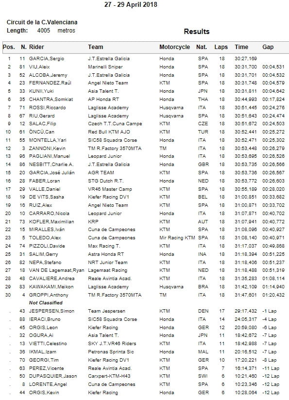 Au championnat, Raul Fernandez fait la bonne affaire devant Manuel Pagliani, situé 10 points derrière. A l’inverse, si Aleix Viu minimise les dégâts avec les 20 points de la première course, Celestino Vietti, pourtant très performant, n’en a toujours marqué aucun.