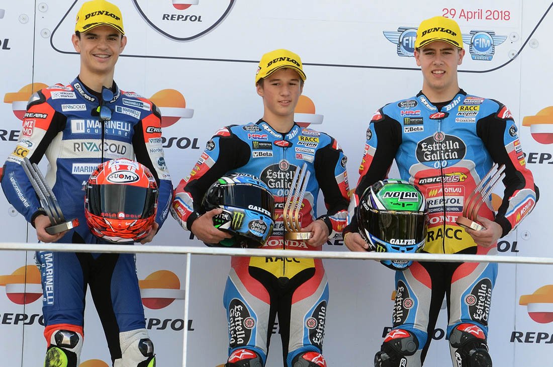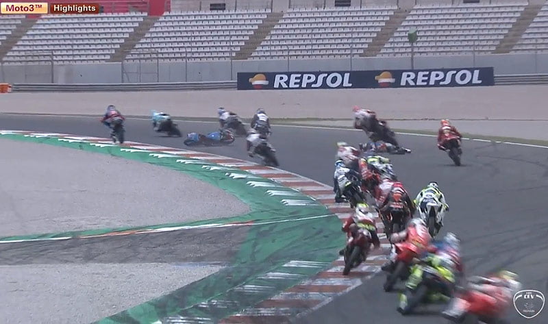 Après avoir remporté en cavalier seul la première course du championnat du monde junior Moto3 FIM CEV à Valence (photo ci-dessous), le Castillan Sergio García a perdu le contrôle de sa moto lors du premier tour de la 2e course.