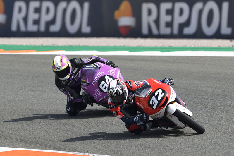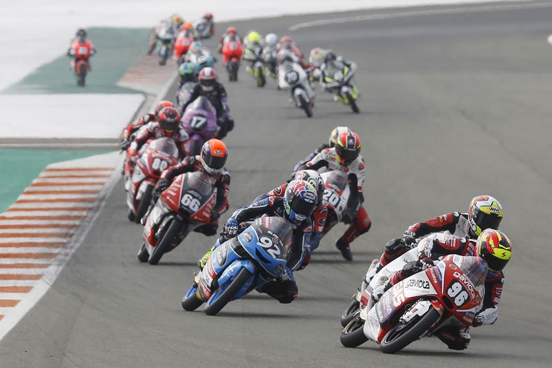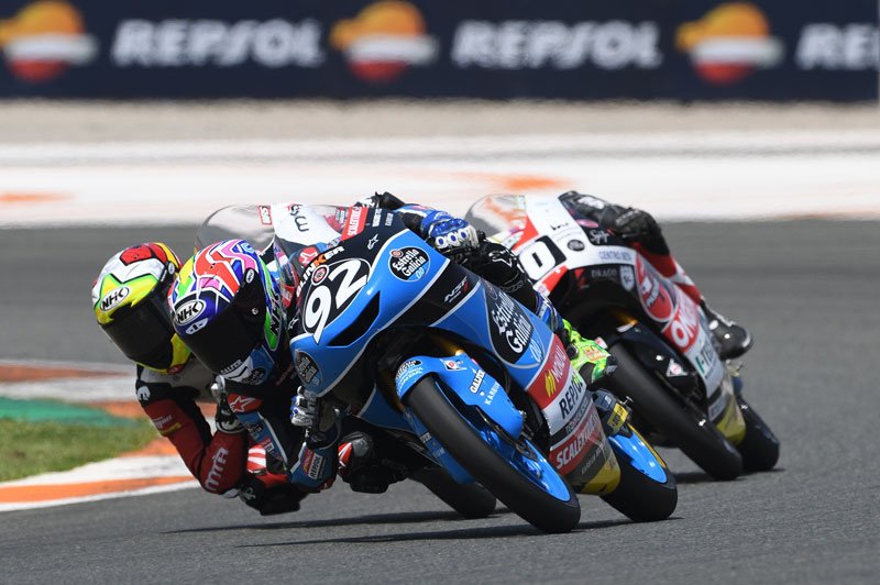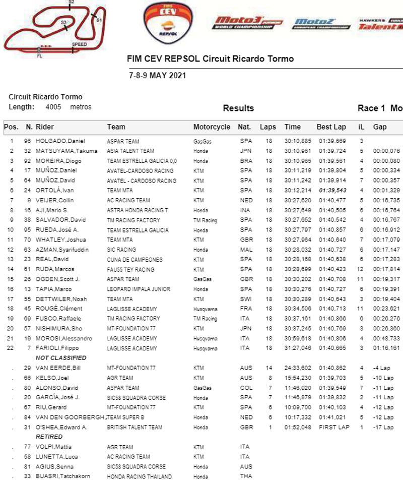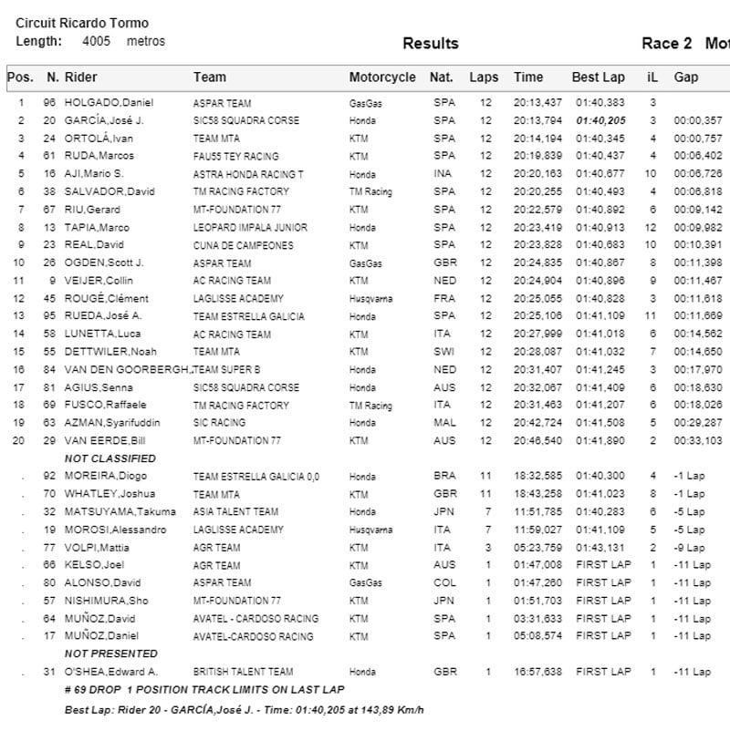 Lorsque la course réduite à 12 tours s’est enfin stabilisée, on a retrouvé un trio familier à l’avant avec Daniel Holgado en tête devant Diogo Moreira et Ivan Ortola, rejoints par Jose Julian Garcia (Honda, SIC58 Squadra Corse) en fin de course. Daniel Holgado réalise toutefois un triplé magique avec une nouvelle victoire, tandis que Jose Julian Garcia tenait tête à Ivan Ortola pour compléter le podium.