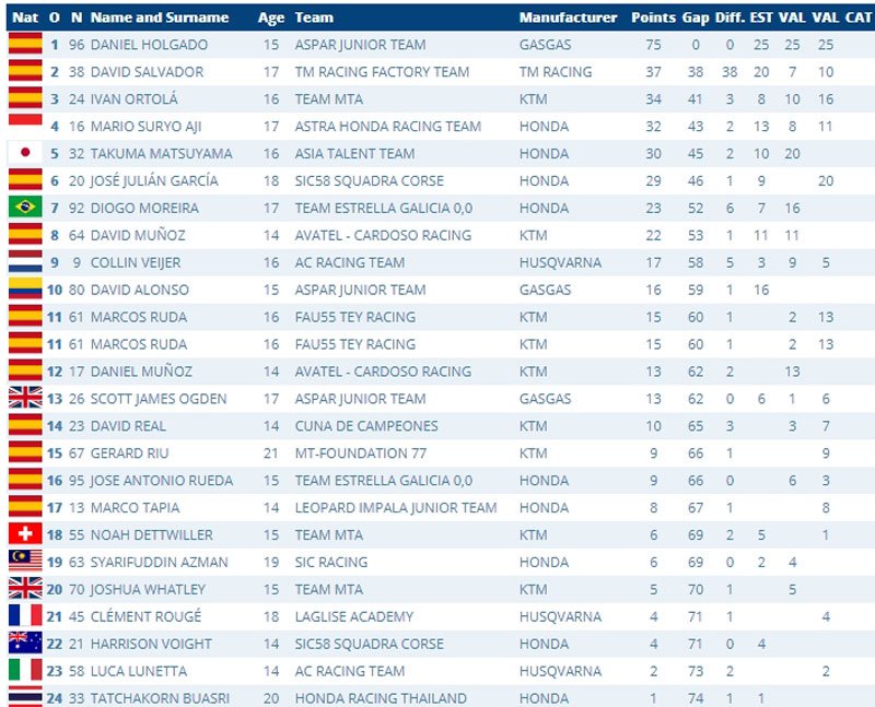 Au classement du championnat, Daniel Holgado (GasGas, Aspar Junior Team) perpétue la perfection avec 75 points, devant David Salvador (TM Factory Racing Team) en deuxième position, Ivan Ortola (KTM, Team MTA) en troisième position et l’Indonésien Mario Aji (Astra Honda Racing Team) en quatrième position.