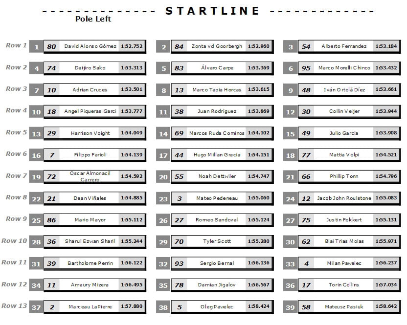 Le pilote Aspar ayant de plus survolé la qualification du matin, la plus rapide, il est positionné en tête de grille lors de cette unique course sur le circuit de Portimão, devant le Néerlandais Zonta van der Goorbergh (Team SuperB) et l’Espagnol Alberto Ferrández (Cuna de campeones).
