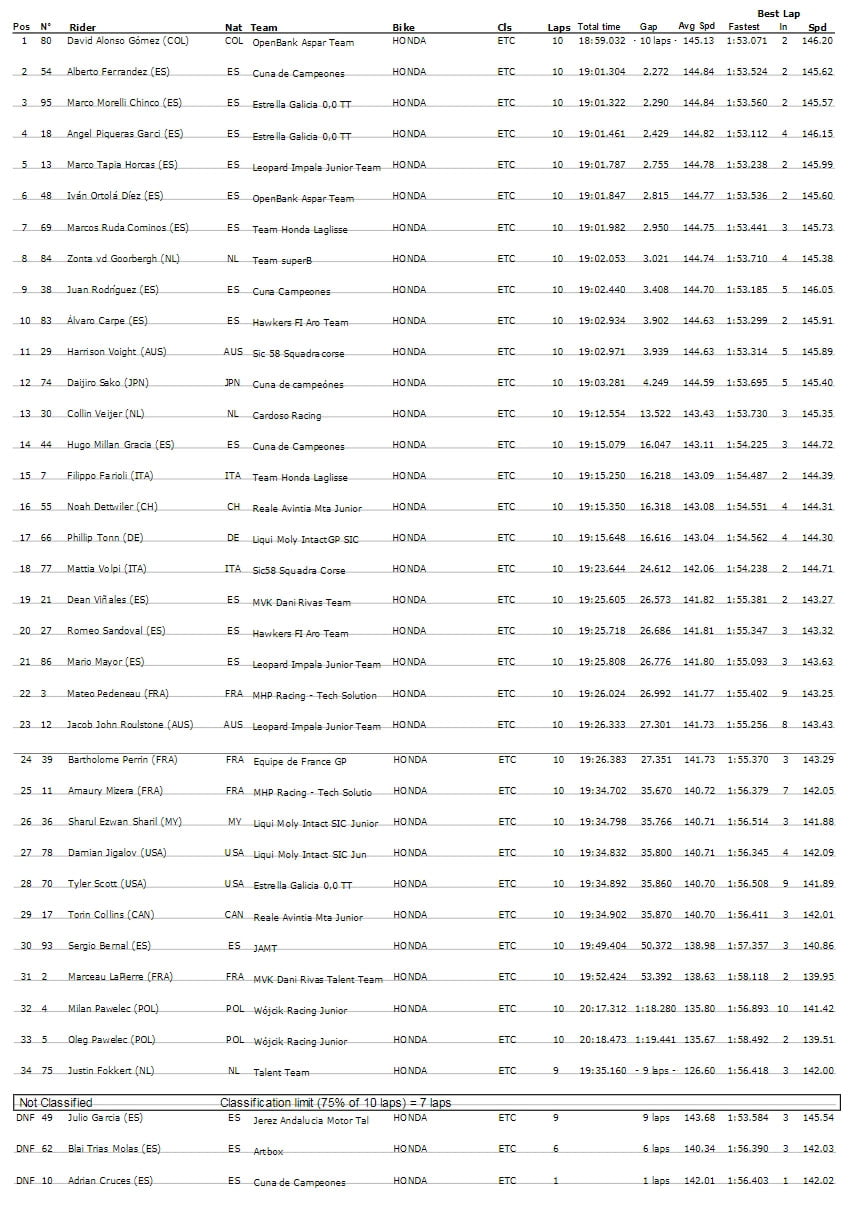Au final, derrière l’inaccessible David Alonso qui remporte son troisième succès en trois courses, Alberto Ferrández (Cuna de campeones) parvient à rallier la deuxième position pour 18 millièmes devant Marco Morelli Chinco (Estrella Galicia 0,0 TT).
