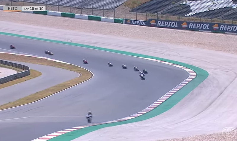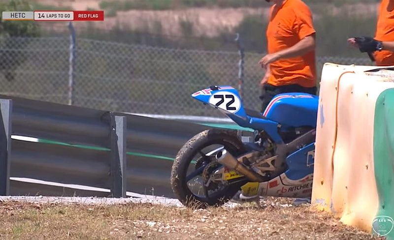 Malheureusement, après un tour, le drapeau rouge est agité à cause d’une violente chute subie par Oscar Almonacil Carrero (H43 Team Nobby Talasur-Blu) qui reste allongé sur une civière au bord de la piste pendant de longues minutes.