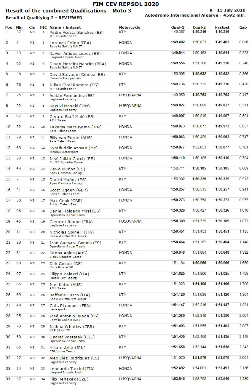 Après s’être qualifié 2ème à Estoril, Pedro Acosta a donc réussi à faire mieux à Portimão, en obtenant sa première pole position dans le FIM Moto3™ Jr WCh ! Moins de 2 dixièmes derrière lui lors de la qualification, ce n’est pas l’homme qui l’a privé de la victoire sur la ligne d’arrivée pour seulement 0,003 seconde, Xavier Artigas (Honda, Leopard Impala Junior Team), comme l’indique le communiqué de presse officiel, mais bien Lorenzo Fellon (Honda, Estrella Galicia 0,0 Junior Team), auteur du deuxième temps, 86 millièmes derrière le poleman.