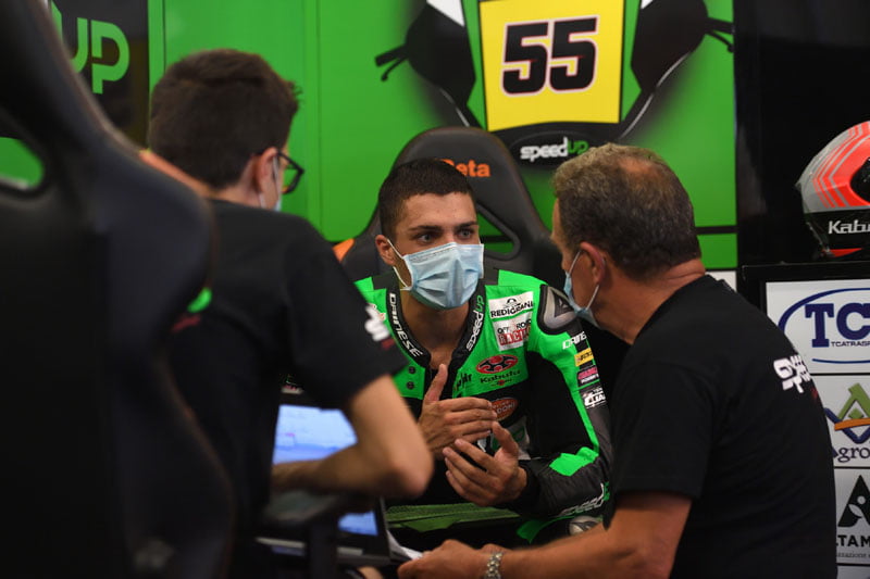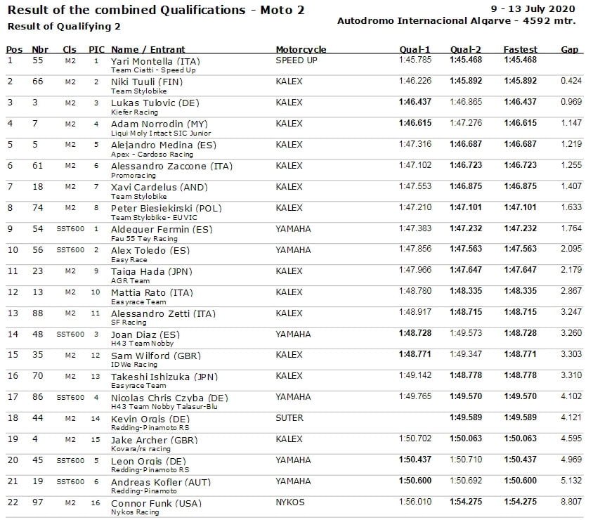 En Championnat d’Europe Moto2™ , Yari Montella (Speed Up, Team Ciatti – Speed Up) a continué sur sa lancée sa domination de la saison 2020. Une pole avec un avantage de plus de 4 dixièmes sur Niki Tuuli (Kalex, Team Stylobike) fait de lui l’homme à battre. Lukas Tulovic (Kalex, Kiefer Racing) se classe 3ème tandis que Adam Norrodin (Kalex, Liqui Moly IntactGP SIC Junior Team) se qualifie 4ème, une amélioration par rapport à sa 9ème place d’Estoril.
