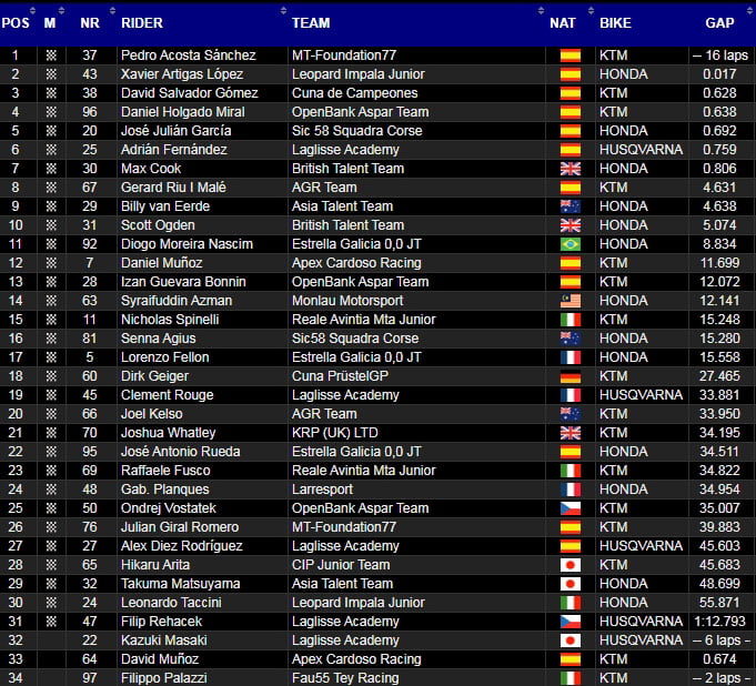 Xavier Artigas maintient toutefois son leadership devant l’Husqvarna d’Adrian Fernández et la KTM de Pedro Acosta avant que ce dernier parvienne à prendre le commandement grâce à une aspiration à 11 tours du drapeau à damier.