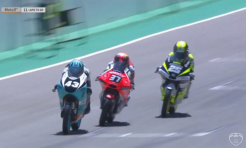 A la mi-course, ils sont six à pouvoir briguer une place sur le podium, David Salvador Gómez (KTM, Cuna de Campeones), Daniel Holgado (KTM, OpenBank Aspar Team) et José Julián Garcia (Honda, SIC58 Squadra Corse) ayant recollé aux hommes de tête. Max Cook (Honda, British Talent Team) parvient également à intégrer plus ou moins ce groupe de prétendants à quelques tours du drapeau à damier.