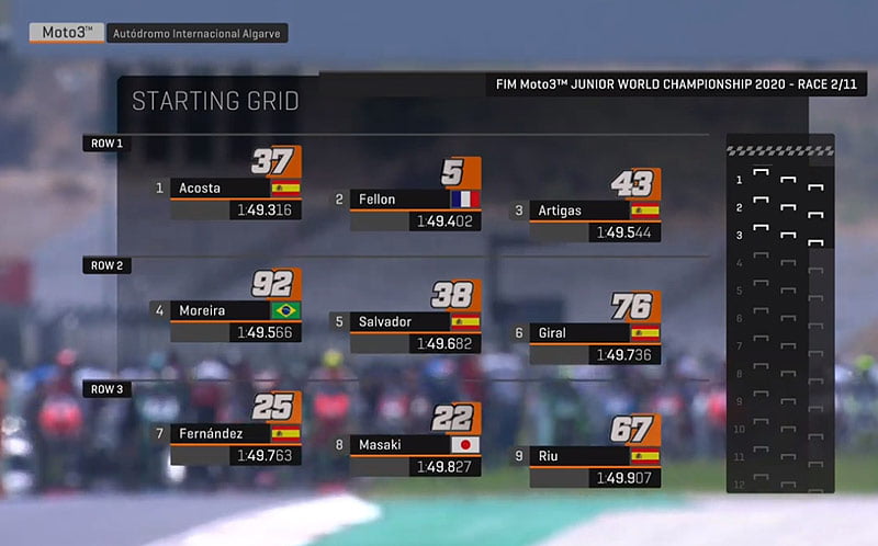 Lorenzo Fellon (Honda, Junior Team Estrella Galicia 0,0), qualifié en deuxième position, aura fort à faire en s’élançant entre le poleman Pedro Acosta (KTM, Team MT-Foundation 77) et le vainqueur de la première course qui s’est déroulée à Estoril, Xavier Artigas (Honda, Leopard Impala Junior Team).