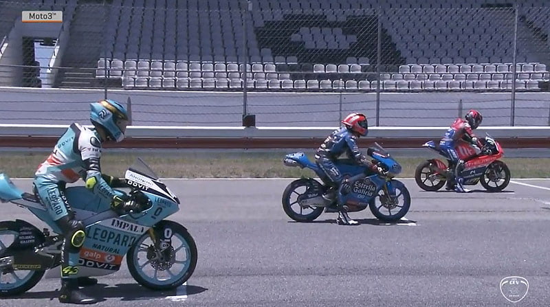 Au moment où les feux rouges sont allumés, il semble bien que Lorenzo Fellon bouge un peu sa moto (on apprendra plus tard que c’est dû à un problème technique), ce qui fait craindre une pénalité, alors que le meilleur départ est effectué par Xavier Artigas depuis sa 3e position devant Pedro Acosta. Le pilote français maintient une troisième place devant le numéro 25.