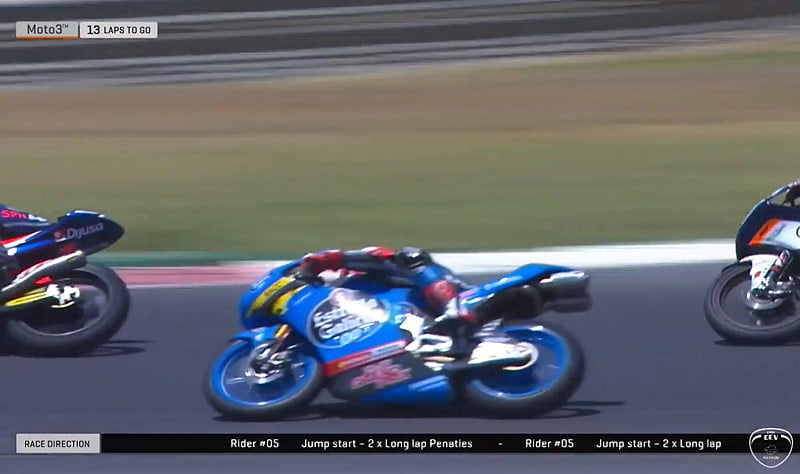 Au moment où les feux rouges sont allumés, il semble bien que Lorenzo Fellon bouge un peu sa moto (on apprendra plus tard que c’est dû à un problème technique), ce qui fait craindre une pénalité, alors que le meilleur départ est effectué par Xavier Artigas depuis sa 3e position devant Pedro Acosta. Le pilote français maintient une troisième place devant le numéro 25.