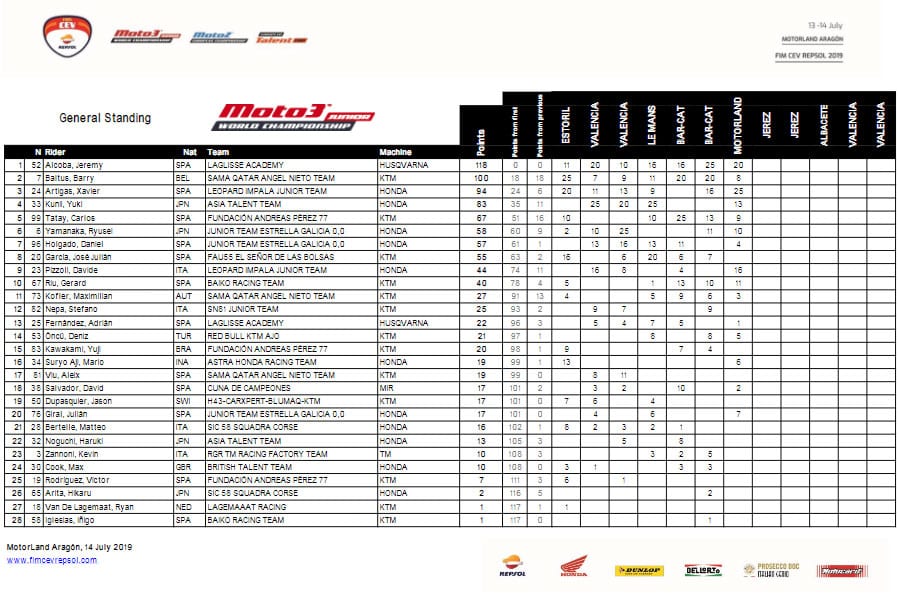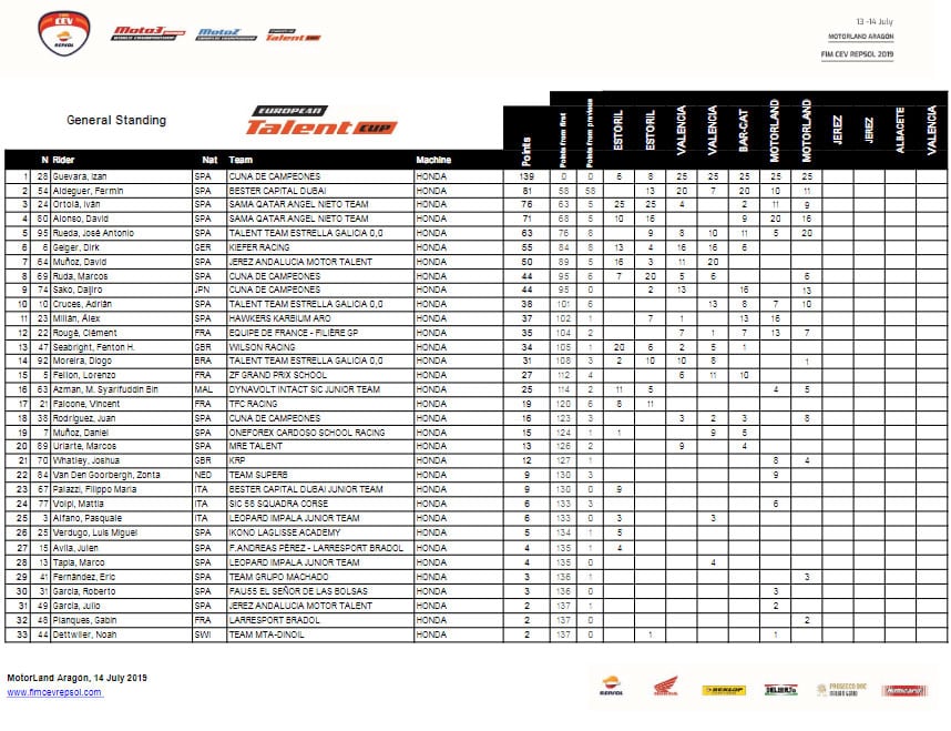 Yuki Kunii (Asia Talent Team) ne s’est pas encore remis de sa blessure et va manquer la rencontre de Jerez et, avec elle, les chances de prendre la tête, ce qui semblait possible en début de saison après Valence. Carlos Tatay (KTM, Fondation Andreas Pérez 77), cinquième au classement général, a été proclamé champion de la Red Bull MotoGP Rookies Cup et Ryusei Yamanaka (Honda, Junior Team Estrella Galicia 0.0) fera également de son mieux pour remonter sur le podium et améliorer sa sixième place au classement.