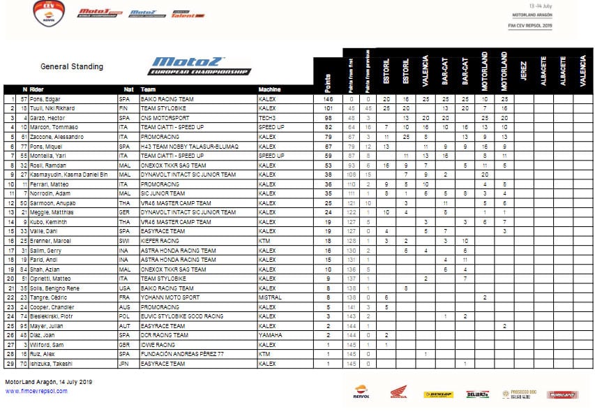 Après Jerez, 75 points resteront en jeu et Pons pourrait quitter l’Andalousie avec le titre presque en poche pour la prochaine manche FIM CEV Repsol à Albacete, tandis que Cédric Tangre, unique Français de la catégorie Moto2, est actuellement en 22e position.