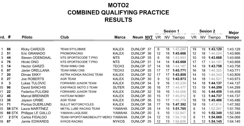 En catégorie Moto2, qui n’aligne que 15 motos plus 3 SuperStock, c’est donc Ricky Cardús (Kalex, team Stylobike) qui précède d’une demi-seconde le leader du championnat Eric Granado (Kalex, promoracing) et Steven Odendaal (NTS, NTS Sportscode T-Pro).