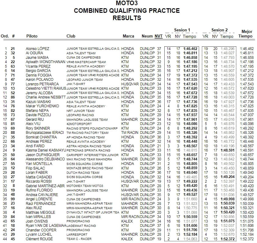 Des conditions quasi parfaites, qui ont donc permis, en Moto3, à Alonso López (Honda, Junior team Estrella Galicia) de s’emparer de sa première pole position grâce à un chrono inscrit en matinée, 4 dixièmes devant le Japonais Ai Ogura (Honda, Asia Talent Team) et Jaume Masia (KTM, Cuna de Campeones).