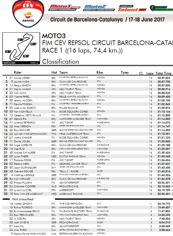 Une boucle plus tard, on retrouve les trois pilotes du Estrella Galicia 0,0 Junior Team en tête des opérations mais Dennis Foggia profite de la ligne droite pour entamer le dernier tour devant ses adversaires et le pilote de Valentino Rossi parvient à conserver trois longueurs d’avance jusqu’à la ligne d’arrivée. Son surnom de « The Rocket » n’a pas été choisi au hasard…