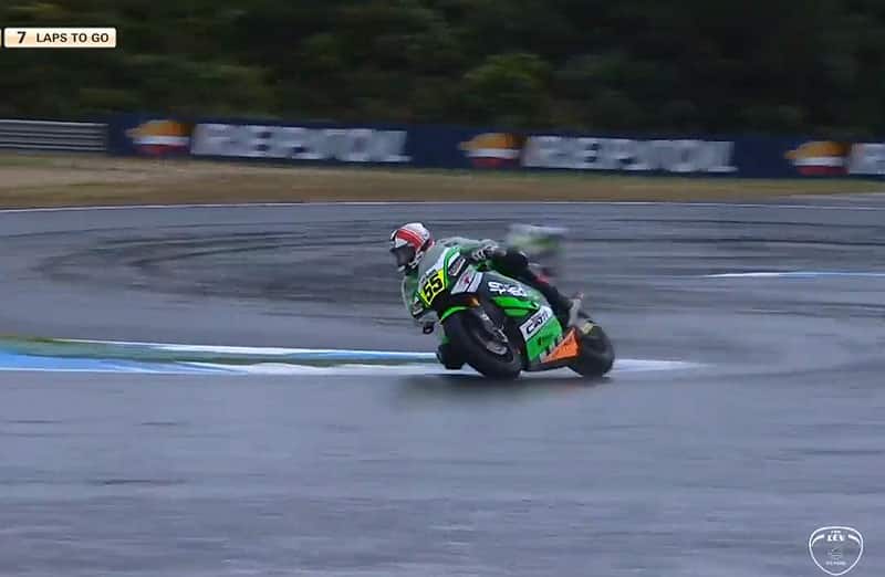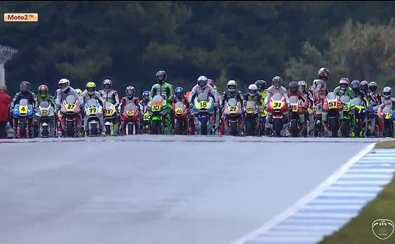 Pour la première course des Moto2, la pluie a cessé mais le revêtement du circuit portugais est encore complètement mouillé, le tout avec 13° dans l’air et 15° au sol.