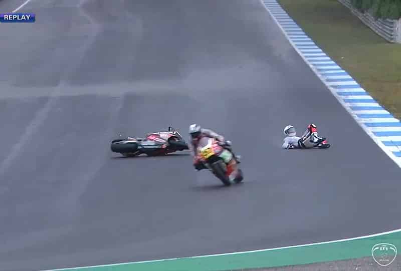 À 9 tours du drapeau à damier, l’Allemand Leon Orgis (Yamaha, Pinamoto RS) et le Thaïlandais Anupab Sarmoon (Kalex, VR46 Master Camp Team) s’accrochent et chutent, totu comme l’Indonésien Gerry Salim (Kalex, Astra Honda Racing team) 2 boucles plus tard.