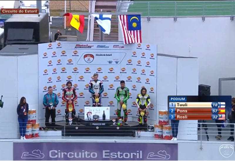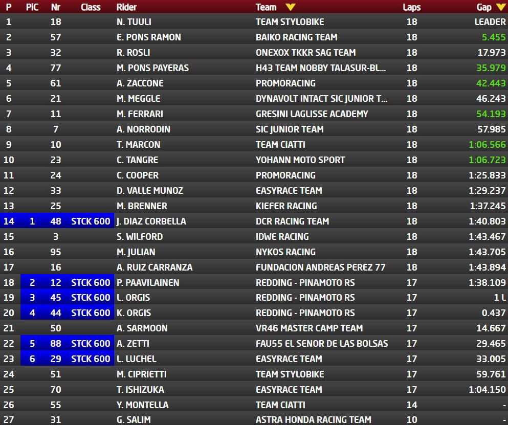 Niki Tuuli (Kalex, Team Stylobike) récupère donc le leadership, 6 secondes devant Edgar Pons (Kalex, Baiko Racing Team) et 13 secondes devant Ramdan Rosli (Kalex, Onexox TKKR SAG Team), et les 3 hommes franchiront la ligne dans cet ordre sans davantage de surprise.