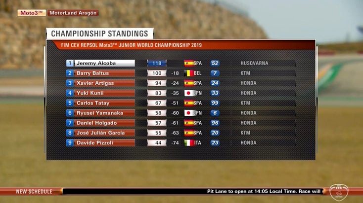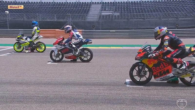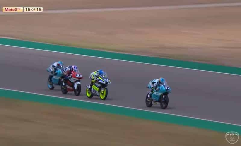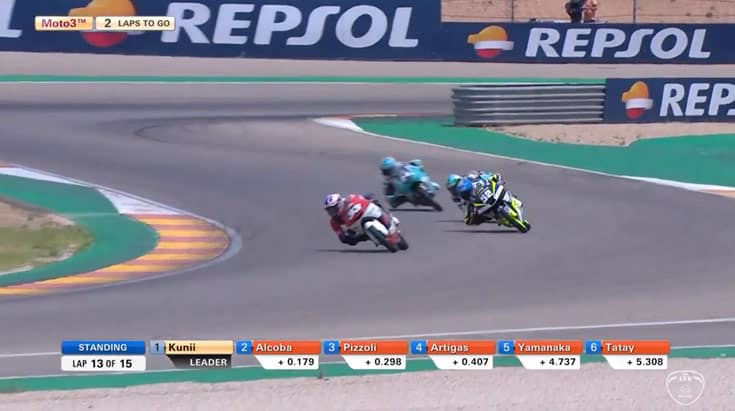 Avant d’entrer dans l’ultime tour de cette course, Yuki Kunii (Honda, Asia Talent Cup) conserve la première place qu’il tient depuis deux tours. Derrière lui se trouvent Jeremy Alcoba (Husqvarna, Laglisse Academy) ainsi que les deux pilotes Leopard, Xavier Artigas et Davide Pizzoli qui se battent pour la seconde position.
