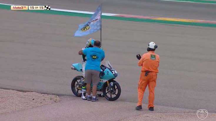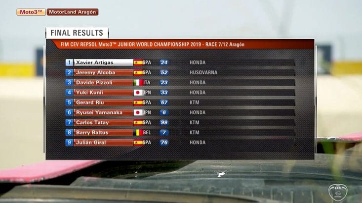 Le numéro 24 s’impose, suivi de Jeremy Alcoba (Husqvarna, Laglisse Academy) et Davide Pizzoli (Honda, Leopard Impala Junior Team). Yuki Kunii (Honda, Asia Talent Cup) termine quatrième, n’ayant pas réussi à dépasser l’italien sur la ligne droite.