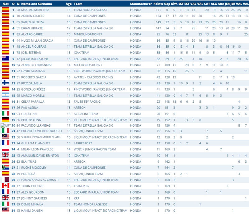 Dans la course 1 de l’European Talent Cup, Máximo Martínez (Team Honda Laglisse) n’a montré aucun signe de pression en tête du championnat. L’Espagnol s’est imposé face à Jacob Roulstone (Leopard Impala Junior), ce qui lui donnait 20 points d’avance sur Xabi Zurutuza et Adrian Cruces (Cuna de Campeones) avant l’épreuve finale.