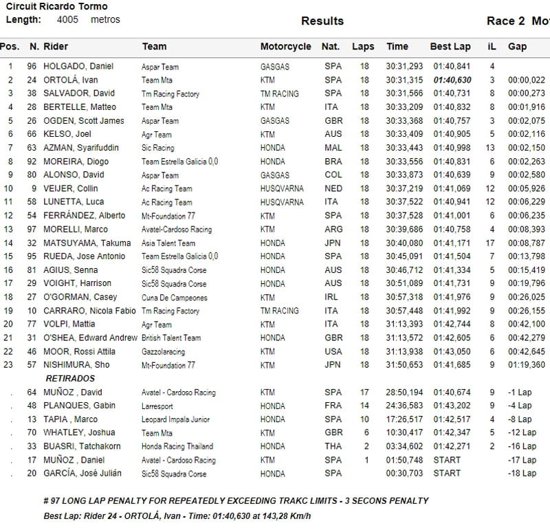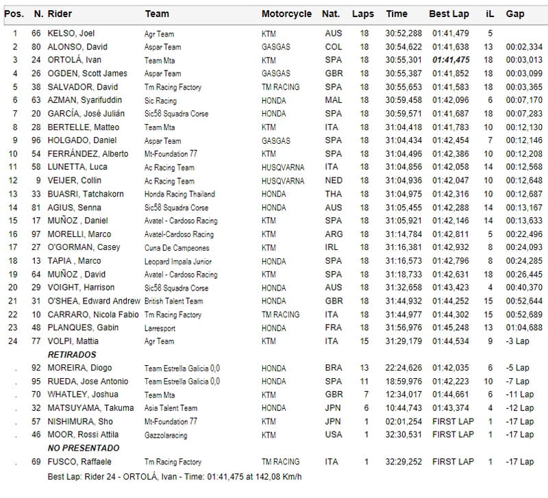 Dans la Course 2, Daniel Holgado a fait le holeshot et a été dans le groupe de tête tout au long d’une course qui s’est finalement jouée dans le dernier tour. Iván Ortolá a mené jusqu’au dernier virage, mais Daniel Holgado s’est alors emparé de la victoire pour terminer sa saison en tête, Iván Ortolá et David Salvador (KTM, TM Factory Racing) complétant le podium.