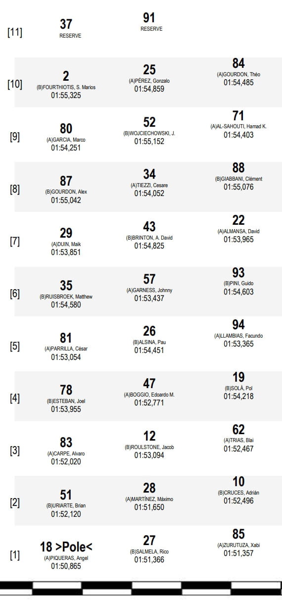 Côté français, avant les deux courses de demain, on notera la première qualification de Clément Giabbani (Équipe De France FFM), qui s’élancera 24e, sur la même ligne qu’Alex Gourdon (Leopard Impala Junior), Théo Gourdon (Leopard Impala Junior) clôturant la grille en 30e position après s’être repêché dans la course de la dernière chance.