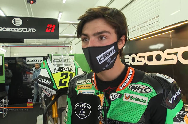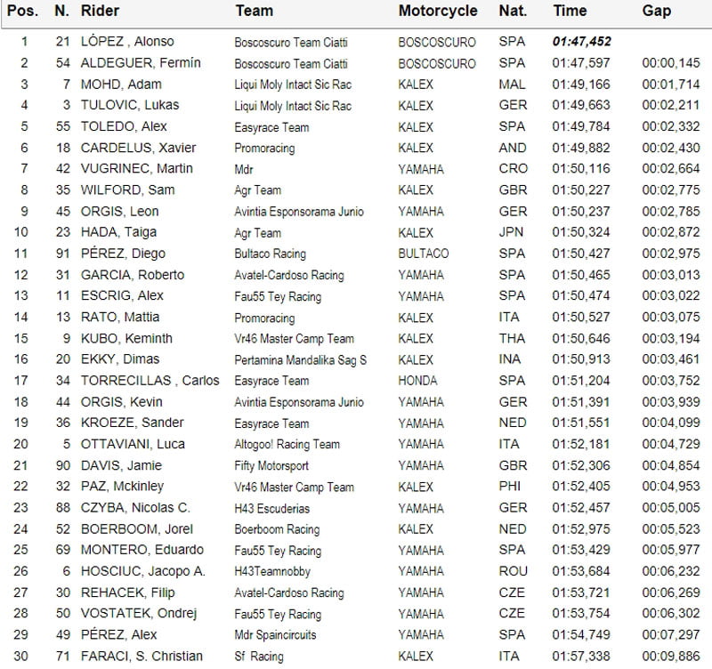 Avant la dernière course de la saison, c’est un duo familier en tête de la grille du Championnat d’Europe Moto2™, Alonso López (Boscoscuro Team Ciatti) devançant son coéquipier et Champion 2021 Fermín Aldeguer. López a attendu jusqu’au dernier tour en QP2 pour battre Aldeguer, le duo étant séparé par 0,145s. Adam Norrodin (Kalex, Liqui Moly Intact SIC Racing) complète la première ligne.