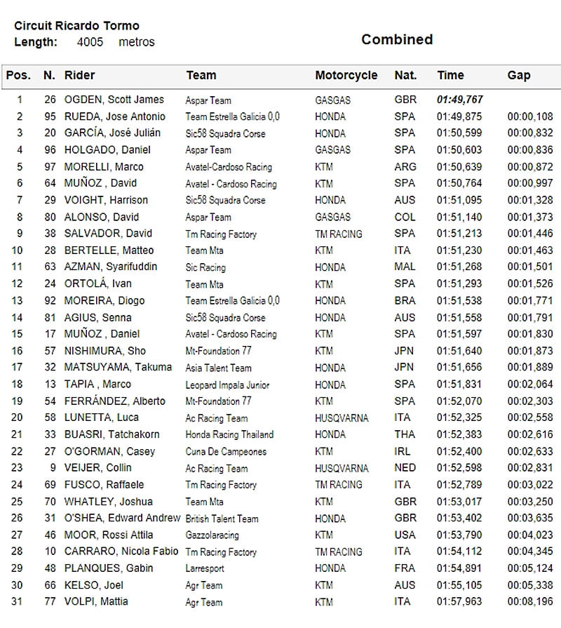 En Moto3™ JWCh, Scott Ogden (GasGas, Aspar Team) a été le plus rapide en QP1 et QP2 pour s’emparer de la pole pour son dernier weekend en tant que pilote du Championnat du Monde Junior. Le pilote britannique a chuté sans se blesser à deux reprises lors de la première séance de qualification, avant de décrocher sa première pole position dans le Championnat du Monde Moto3™ Junior sur le Circuit Ricardo Tormo. Il précède Jose Antonio Rueda (Honda, Team Estrella Galicia 0,0) pour 0,108s dans des conditions légèrement meilleures l’après-midi. Jose Julian Garcia (Honda, SIC58 Squadra Corse) complète la première ligne, tandis que le leader du championnat Daniel Holgado (GasGas, Aspar Team) s’élancera de la P4. Ce départ en deuxième ligne est une excellente chose pour l’Espagnol, avec son plus proche rival pour le titre, David Muñoz (KTM, Avatel-Cardoso Racing), partant de la pitlane suite à une pénalité, et Ivan Ortola (KTM, Team MTA), le seul autre pilote mathématiquement en lice pour le titre, de fait en P11.