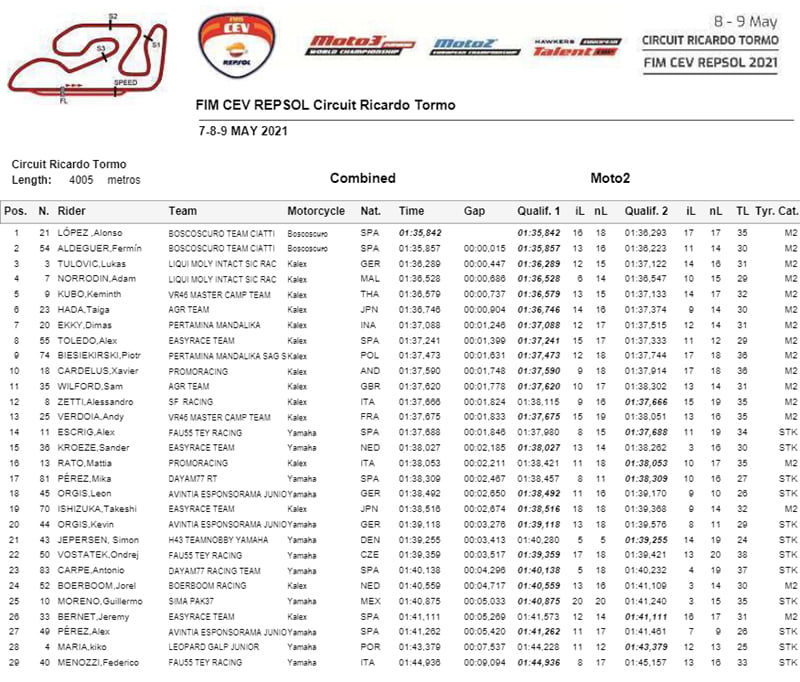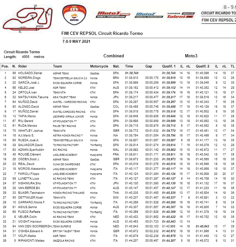 Alors que la grande majorité des pilotes ont réalisé des chronos plus rapides lors de la séance matinale, un 1’38.740 a permis à Daniel Holgado de mener le classement, résistant ainsi au Brésilien Diogo Moreira (Honda, Team Estrella Galicia 0,0), qui a obtenu sa meilleure position sur la grille de départ et sa première ligne depuis Estoril l’an dernier, à 0,170s du temps de la pole. Jose Julian Garcia (Honda, SIC58 Squadra Corse) complète la première ligne, l’Espagnol décrochant également sa deuxième première ligne en carrière.