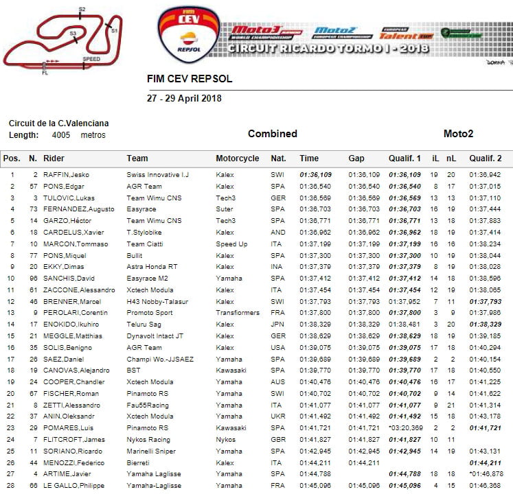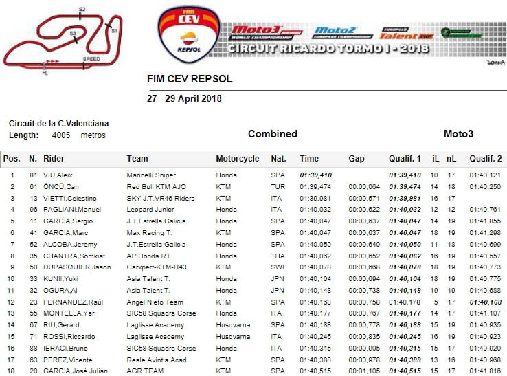 L’élève de José Luis Cardoso n’a pas pu participer à la première épreuve FIM CEV Repsol à Estoril parce qu’il n’avait pas encore l’âge minimum mais à Valence, il mène sa catégorie pour la première fois. Xavier Artigas (Honda Impala), qui a réalisé le meilleur temps combiné du Groupe A, partira deuxième suivi de Barry Baltus (Reale Avintia Academy), deuxième du Groupe B.