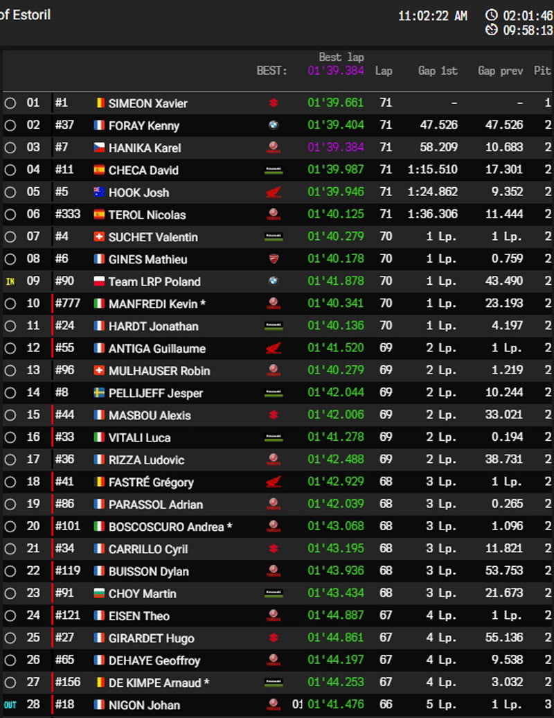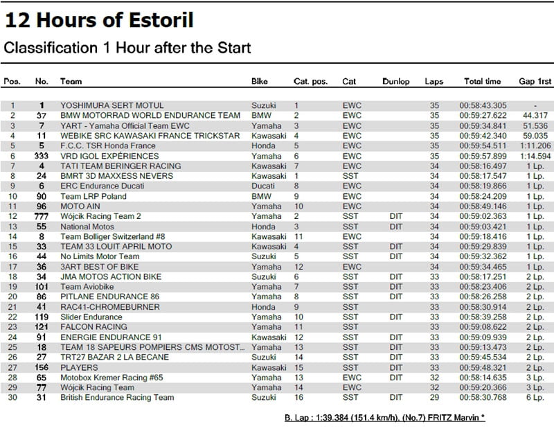 En tête, la situation se décante peu à peu avec la BMW #37 trois secondes devant la Suzuki #1 et huit secondes devant la Yamaha #7. Vient ensuite la Kawasaki #11 à 18 secondes, la Honda #5 à 32 secondes, la Yamaha #3. Trois à 37 secondes et la Kawasaki #4 à 54 secondes. Suivent la Kawasaki #24 à 1’29 et la Yamaha #777 à 1’33, alors que tous les autres concurrents ont plus d’un tour de retard, cela comprenant à l’instant T la Ducati #6 handicapée par ses ravitaillements très précoces.
