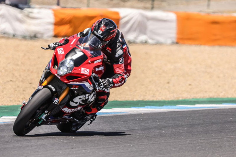 La scène s’est passée au virage #1, sans gravité corporelle pour le pilote d’essai Suzuki MotoGP, mais la GSX-R est immédiatement rentrée à son box pour quelques menues réparations.