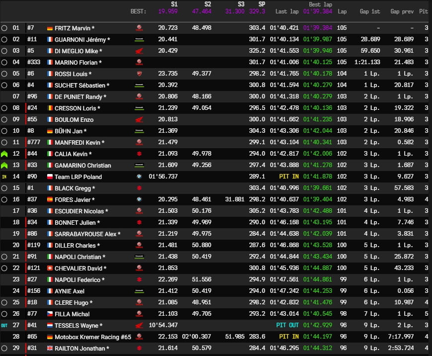 Du coup, c’est bien entendu la Yart Yamaha #7 qui est en tête, avec 28 secondes d’avance sur la Kawasaki #11, une minute sur la Honda #5 et 1’20 sur la Yamaha #333…