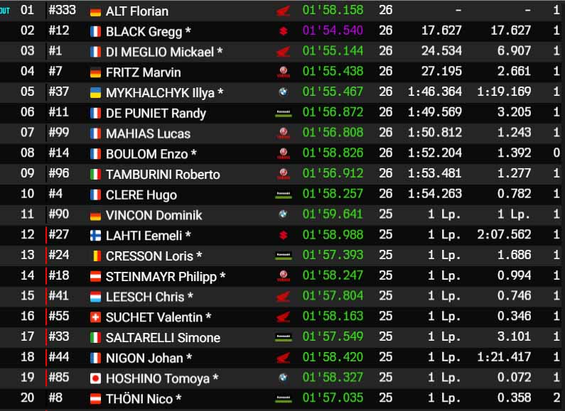 Le Britannique Chaz Davies a tenu bon en tête grâce à une stratégie payante, mais Niccolò Canepa (Yamaha #7), en slicks depuis le départ, s’empare de la première position. On note d’ailleurs une pénalité de stop & go pour la Kawasaki #8 Team Bolliger Switzerland #8, ce qui n’aide pas après moins d’une heure de course.