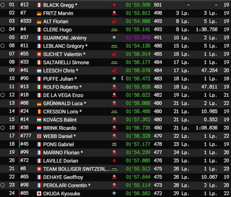 Mais ce n’est pas la seule machine à avoir subi les difficultés inhérentes au Bol d’Or de plein fouet. La BMW #37 BMW Motorrad World Endurance Team, longtemps 3e et bien dans sa course, a aussi fait un passage par le box. Heureusement, elle put en ressortir mais non sans perdre un temps précieux. Elle pointe désormais en cinquième position, à 11 tours de la Suzuki #12.