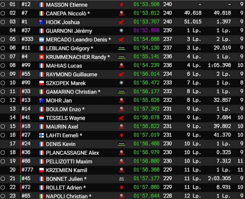 Derrière, la situation est plutôt stable. La Kawasaki ZX-10R #33 BRMT 3D MAXXESS Nevers est toujours deuxième, mais alterne souvent avec la Yamaha #13 OG World Endurance Team en fonction de la stratégie employée.