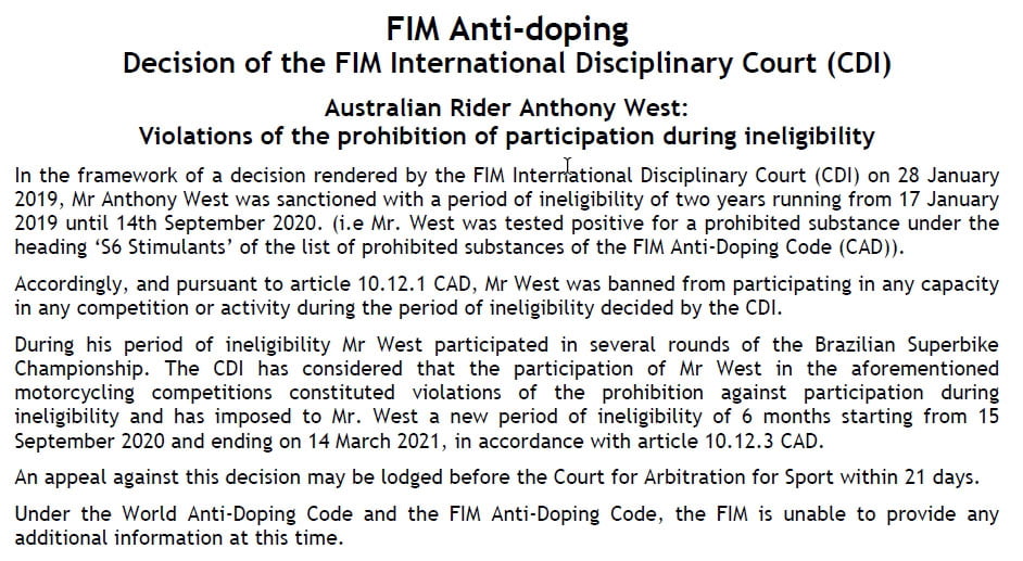 Dans le cadre d’une décision rendue par la Cour disciplinaire internationale (CDI) de la FIM le 28 janvier 2019, M. Anthony West a été sanctionné d’une période d’inéligibilité de deux ans allant du 17 janvier 2019 au 14 septembre 2020. (c’est-à-dire que M. West a été testé positif à une substance interdite sous la rubrique « S6 Stimulants » de la liste des substances interdites du Code antidopage (CAD) de la FIM).