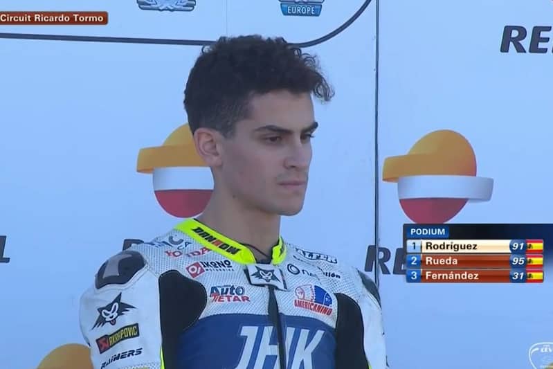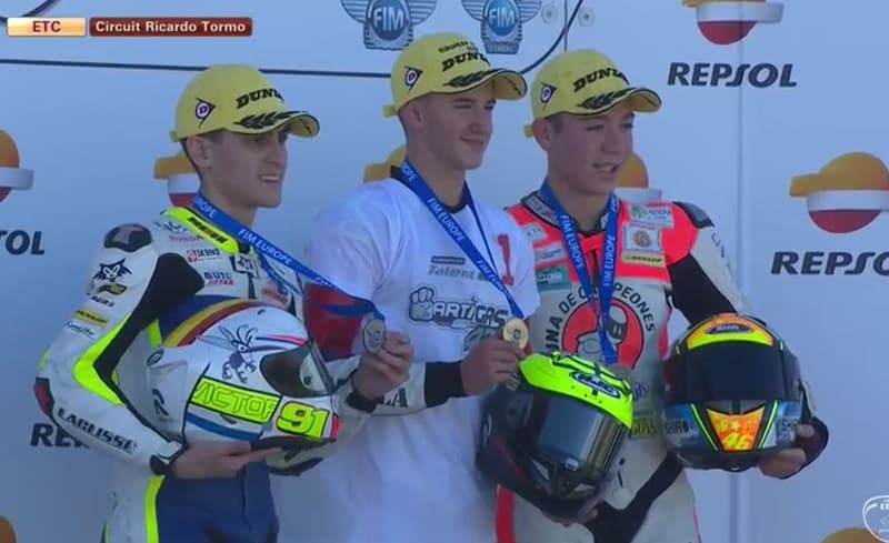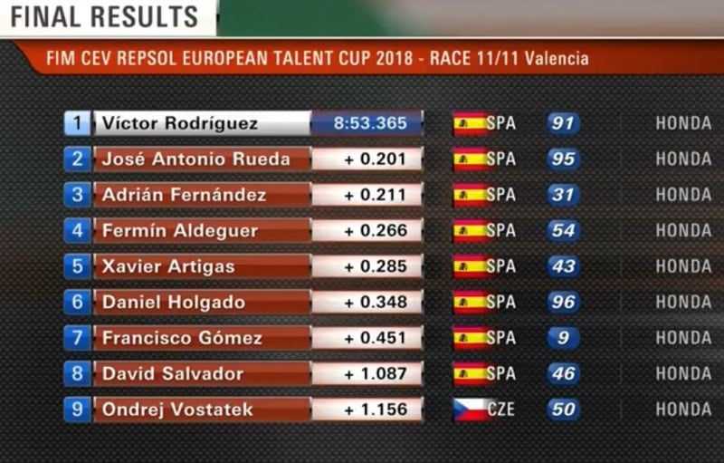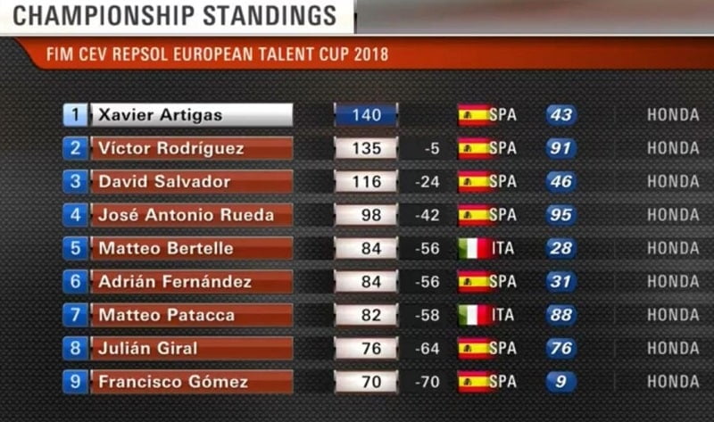 Aldeguer passait en première position, devant Rodriguez, Fernandez, Artigas, Rueda et Gomez. Sur la ligne d’arrivée, l’avantage revenait à Rodriguez devant Rueda et Fernandez. Aldeguer était quatrième devant le nouveau Champion 2018 Xavier Artigas.
