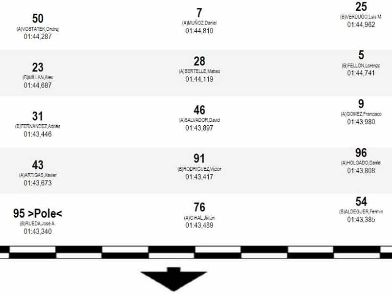 Lors des qualifications, les 53 concurrents étaient répartis en deux groupes. José Rueda était le plus rapide du Groupe B en 1’43.340 et Julian Giral le plus véloce du Groupe A en 1’43.489. Les 46 pilotes qualifiés des deux groupes étaient ensuite répartis sur la grille de départ de la manière suivante :
