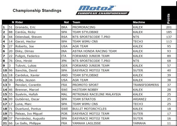 A la veille de cette dernière course de la saison, le Brésilien Eric Granado possède 16 points d’avance sur l’Espagnol Ricky Cardus. Donc, si Cardus gagne, Granado doit terminer au pire septième pour être titré, si Cardus est deuxième, Granado doit terminer douzième, si Cardus est troisième, Granado est Champion au nombre de victoires (cinq).