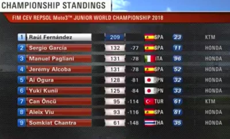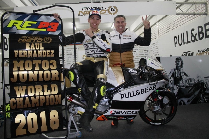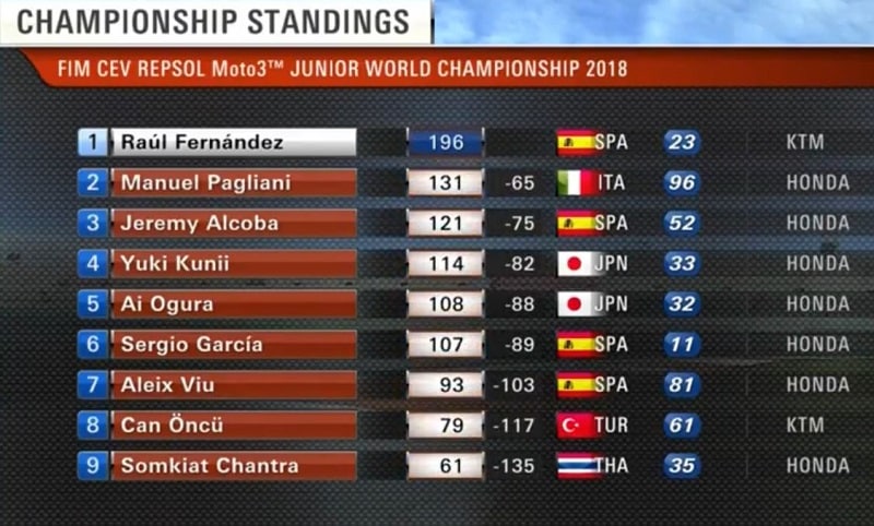 C’était en net vainqueur du Championnat du Monde Junior Moto3 2018 que Raul Fernandez parvenait à Valence avec les 180 points recueillis sur sa KTM de l’Angel Nieto Team, car il précédait Manuel Pagliani, avec 131 points sur sa Honda du Leopard Junior, mais malheureusement forfait pour raisons personnelles. Fernandez et Pagliani devançaient le Japonais Yuki Kunii troisième sur sa Honda de l’Asia Talent Cup avec 114 points, et les deux Espagnols du Junior Team Estrella Galicia Jeremy Alcoba et Sergio Garcia avec respectivement 101 et 96 points. Aucun pilote français ne figurait au classement.