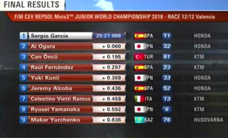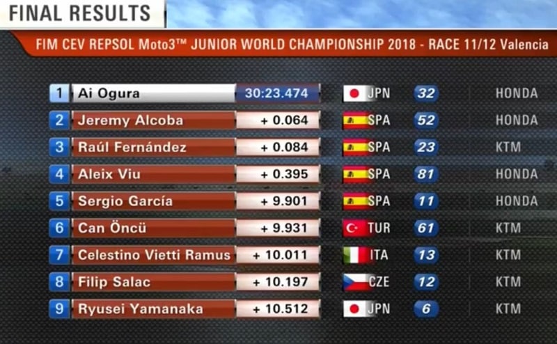 Pour la dernière course du Championnat du Monde Junior 2018, Ai Ogura parvenait à s’élancer en tête devant Yuki Kunii, Raul Fernandez, Jeremy Alcoba, Yari Montella, Sergio Garcia, Makar Yurchenko et Can Öncü. Kevin Orgis chutait sans gravité. Comme en première manche, les deux Japonais Ogura et Kunii imprimaient leur rythme sur la course. Puis Raul Fernandez, le Champion 2018 de la catégorie, passait en deuxième position. Can Öncü, vainqueur du GP Moto3 dimanche dernier ici à Valence, remontait à la cinquième place après une première course peu satisfaisante, sinon décevante. Celestino Vietti, le poulain de Rossi, passait en neuvième position derrière Makar Yurchenko.