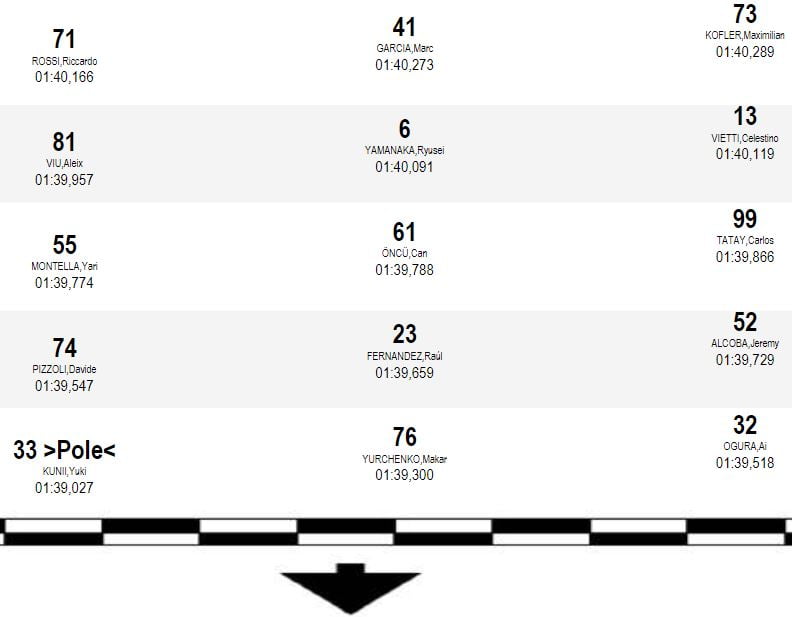 Lors de l’extinction des feux, Yuki Kunii était le plus prompt à s’élancer devant Ai Ogura et Raul Fernandez, le nouveau champion de la catégorie pour l’équipe de Jorge Martinez « Aspar ». Jeremy Alcoba réussissait à subtiliser la troisième position à son compatriote Fernandez. Yari Montella était alors cinquième devant Makar Yurchenko, Aleix Viu, Davide Pizzoli et Can Öncü.