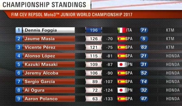 Derrière Dennis Foggia déjà titré Champion du Monde Junior, la lutte était très serrée pour la deuxième position entre Jeremy Alcoba qui comptait 106 points, Vicente Perez qui en totalisait 105, Alonso Lopez avec 102, Jaume Masia avec 101 et Kazuki Masaki avec 99.