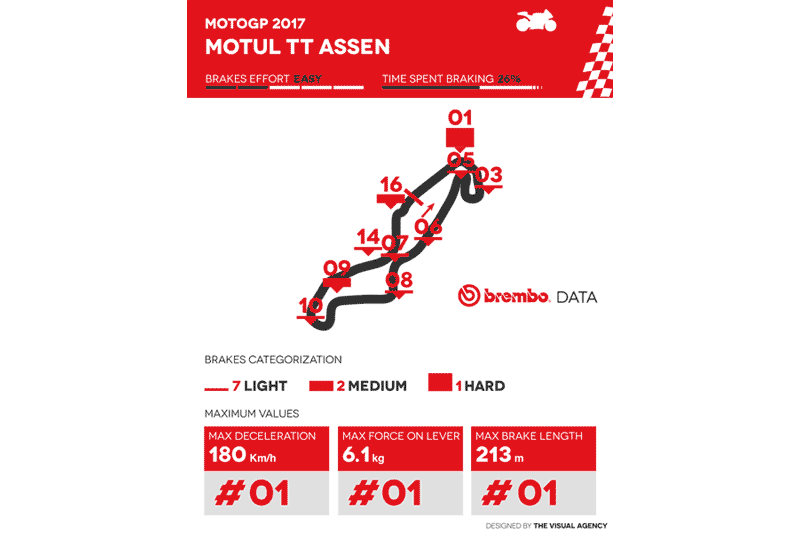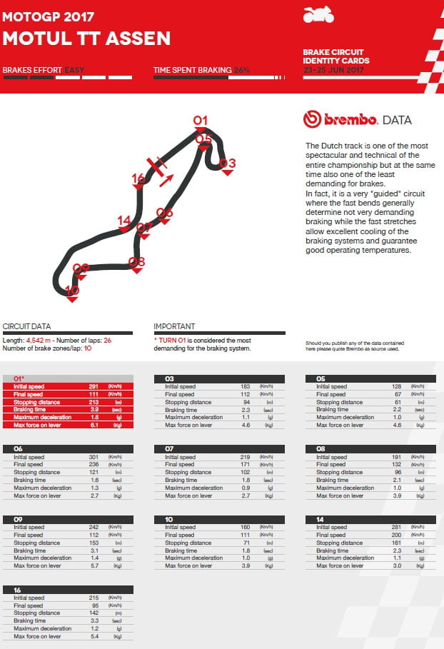 Autant le dire tout de suite, le circuit d’Assen ne présente aucune difficulté pour les systèmes de freinage, puisque sur les 18 virages que compte le circuit, les pilotes MotoGP ne freinent que 10 fois, alors qu’un seul freinage a lieu sur plus de 160 m, en l’occurrence au virage #1.