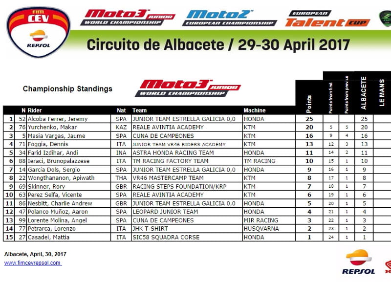 Après la première manche qui s’est déroulée à Albacete (voir notre article ici), le classement provisoire est le suivant : Jeremy Alcoba (Junior Team Estrella Galicia 0,0) mène devant Makar Yurchenko (Reale Avintia Academy) et Jaume Masia (Cuna de Campeones).