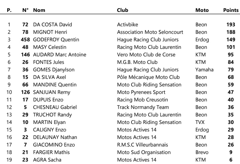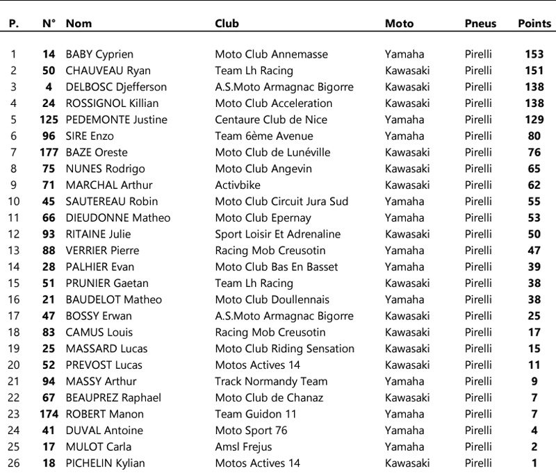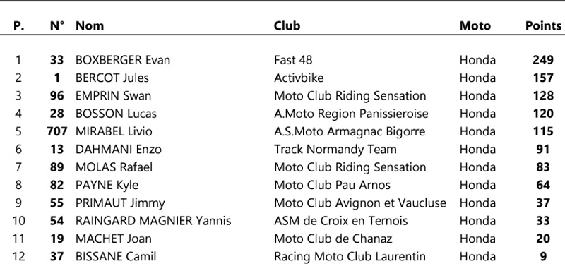 Les courses seront également animées par une belle lutte pour la troisième marche du podium opposant Swan EMPRIN (Honda – Bridgestone), 128 points, à Lucas BOSSON (Honda – Bridgestone) , 120 points, et Livio MIRABEL (Honda – Bridgestone), 115 points.