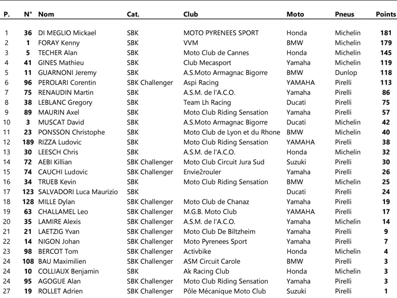 Après 5 victoires sur les 6 dernières courses, le Champion de France en titre Kenny FORAY (BMW Tecmas – Michelin) revient à 2 points de l’irréductible Mike DI MEGLIO (Honda CBO – Michelin). Dans son jardin, le Circuit Carole, FORAY devrait avoir un léger avantage sur DI MEGLIO. Mais le pilote Honda gère très bien ses temps faibles en sauvegardant de gros points lorsqu’il n’est pas en mesure de lutter pour la victoire avec son rival. Alors, qui de DI MEGLIO ou FORAY basculera en tête avant la dernière étape du Championnat ?