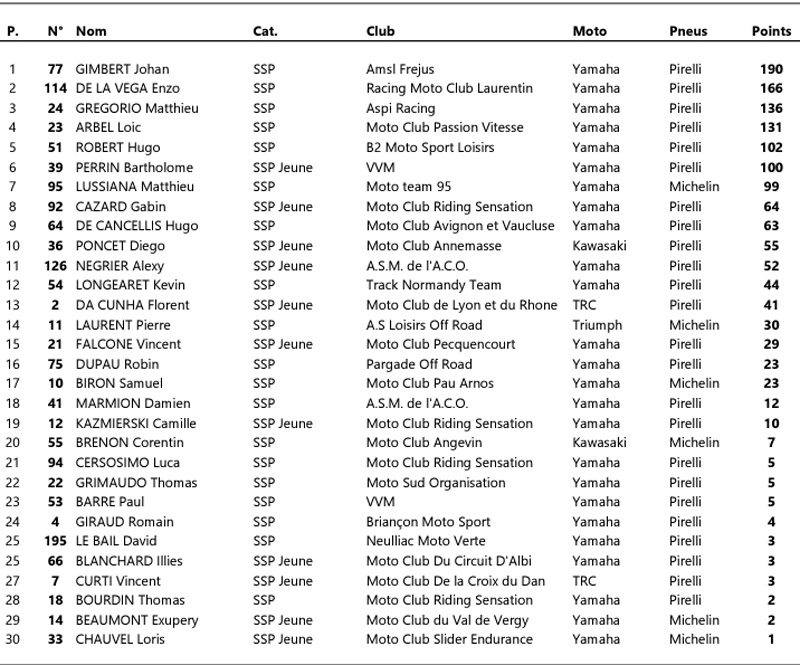 Malheureux lors de la dernière étape, Mathieu GINES (Yamaha Supported Team 41 Performance – Michelin) semble désormais écarté de la lutte pour le titre. Rétrogradé au 4ème rang après avoir lourdement chuté à Pau, rien ne dit que le breton sera en mesure défendre ses chances à Carole. Sa place dans le top 5 sera menacée par Jérémy GUARNONI (BMW MDS – Dunlop), fort  de son double podium obtenu dans le Béarn, et Corentin PEROLARI (Yamaha Moto Ain – Pirelli), toujours aussi régulier, mais plus monté sur la boite depuis Le Mans.